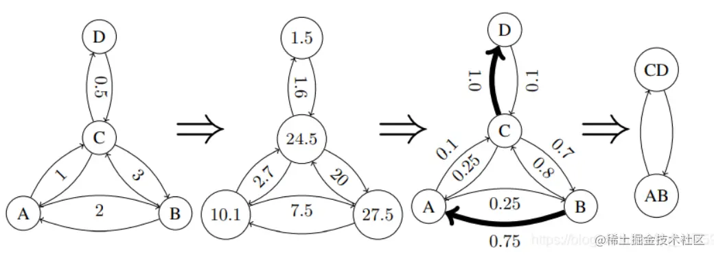 基本思路:迭代式地对每条边上的节点进行两两归并形成一个新的节点,同时胞瘤合并前两个节点的连接关系到新节点上。