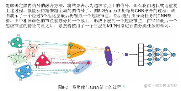 图坍缩就是将图中的节点划分为几个节点簇(子图),将每个节点簇看作一个超级节点,从而形成一个坍缩的图,并作为下一次图坍缩的节点。图坍缩与GNN结合过程: