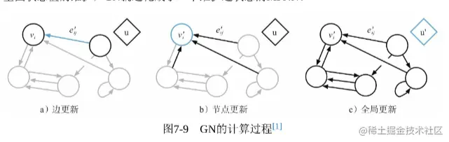 GN的更新思路:由点更新边,边聚合更新点,点聚合与边聚合更新图,这里更新的时候还需要考虑上一轮自身的状态。
