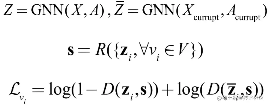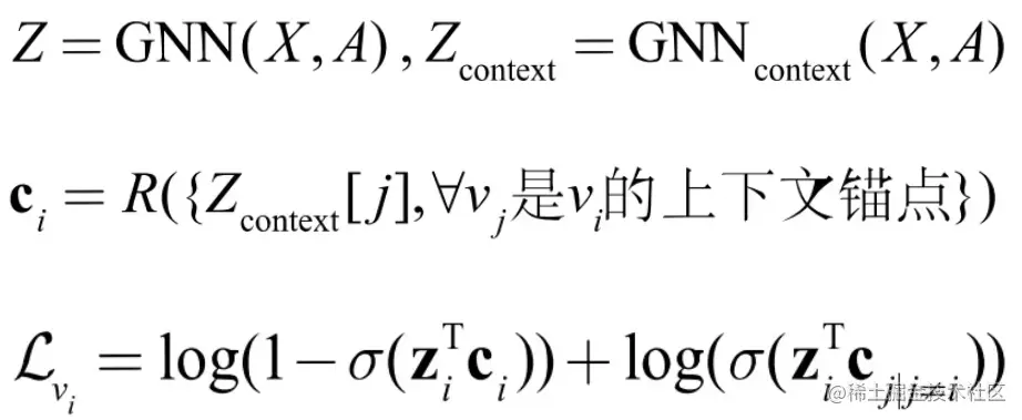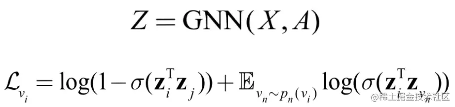 如果把邻居作为上下文 ,那么上述对比损失就在建模节点与邻居节点的共现关系。在 GraphSAGE 的论文中就描述了这样的一种无监督学习方式,与 DeepWalk 一样,我们可以将在随机游走时与中心节点 vi 一起出现在固定长度窗口内的节点 vj 视为邻居,同时通过负采样的手段,将不符合该关系的节点作为负样本。与 DeepWalk 不一样的是,节点的表示学习模型还是使用 GNN,即: