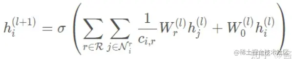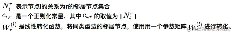 R-GCN基于GCN的邻居聚合操作,又增加了一个聚合关系的维度,使得节点的聚合操作变成一个双重聚合操作,核心公式如下: