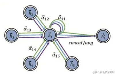 进一步提升注意力层的表达能力,可以加入多头注意力机制(multi-head attention),即对节点调用K组相互独立的注意力机制,然后将输出的结果拼接在一起: