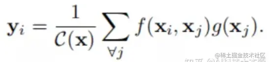 i是输出位置的索引,j是枚举所有可能位置的索引。f(x_i,x_j)是i位置和j位置上元素之间的相关度函数,g(x_j)表示对输入x_j进行变换的变换函数,1/C(x)用于归一化。