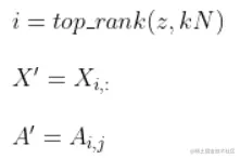 TopK池化机制和图坍缩不同,图坍缩是将图的节点不断聚合成簇的过程,而TopK是一个不断抛弃节点的过程,具体来说就是设置一个超参数k,其中k的取值范围为(0,1),接着学习出表示节点重要度的值z,并按照重要度对节点进行降序排序,然后将全图中N个节点下采样至最重要的kN个节点,公式表示如下: