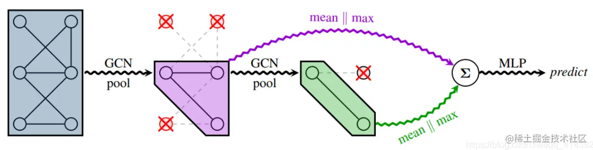 该模型设置了两层gpool层,对应设置了两个读出层,再对两层读出层进行加和得到全图的向量表示。