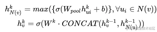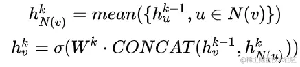 (1)**平均聚合:**先对邻居embedding中每个维度取平均,然后与目标节点embedding拼接后进行非线性转换。v是中心节点,u是邻居节点,h是节点特征,W是聚合操作需要学习的参数。