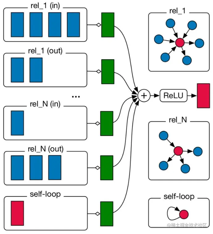 上图中先对同种关系的邻居进行单独聚合,这里考虑了关系的正反方向,同时对于自身加入了自连接的关系,将所有不同关系的邻居聚合之后,再进行一次总的聚合。