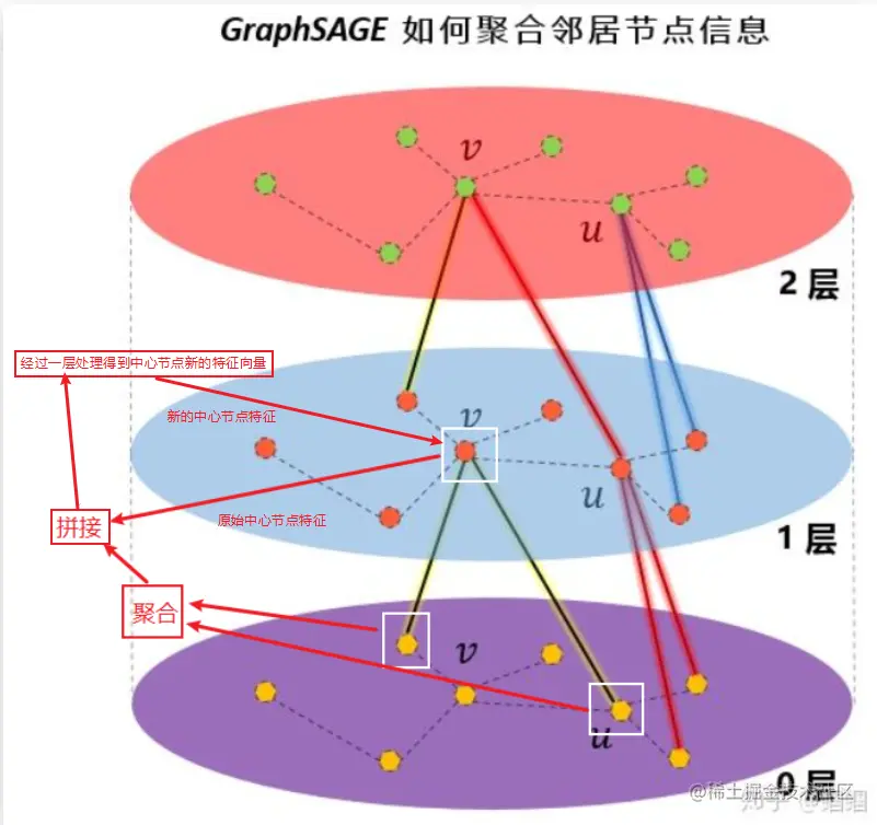 第K层是最顶层,1层是最底层,所以采样时是从第顶层到底层去找邻居节点,聚合时从底层到顶层逐层进行聚合。