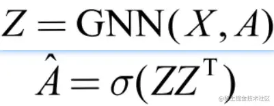 其中,Z 是所有节点的表示,这里借助 GNN 模型同时对图的属性信息与结构信息进行编码学习。A^ 是重构之后的邻接矩阵,这里使用了向量的内积来表示节点之间的邻接关系。图自编码器的重构损失可以定义如下: