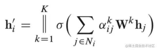 ||表示拼接操作,**a_k_ij **是K组注意力机制计算出的权重系数,W_k是对应的学习参数。