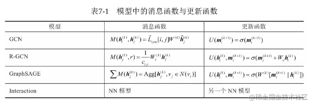通过消息传递机制对多种GNN模型做出了一般化总结。基本思路为:节点的表示向量都是通过消息传递函数M(Message)和更新函数U(Update)进行K轮消息传播机制迭代后得到的,消息传播过程如下:
