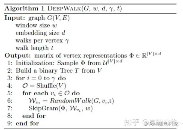 1行初始化节点向量矩阵。4行是打乱节点(词汇表),生成一个随机排序来遍历所有节点。5~8行对于每一个节点进行随机游走获得游走序列,并使用Skip-Gram模型训练。6行使用随机游走算法获得游走序列。7行使用Skip-Gram模型进行训练,获得节点的向量表示。