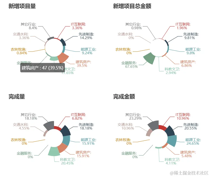 塔米周报按照行业对新增项目量、新增项目总金额、完成项目量、完成项目金额进行了统计并可视化展示。
