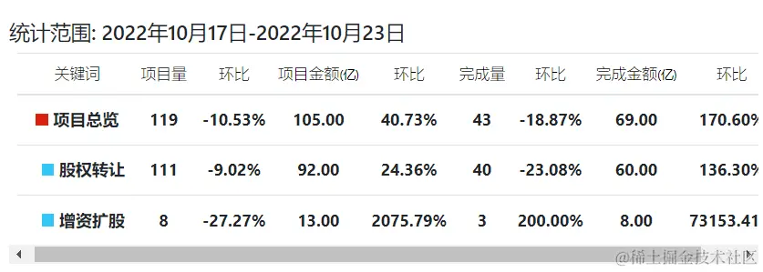 主要对项目总览、股权转让、增资扩股进行汇总,从项目量、项目金额、完成量、完成金额等维度出发,并做了环比计算。详情如下图: