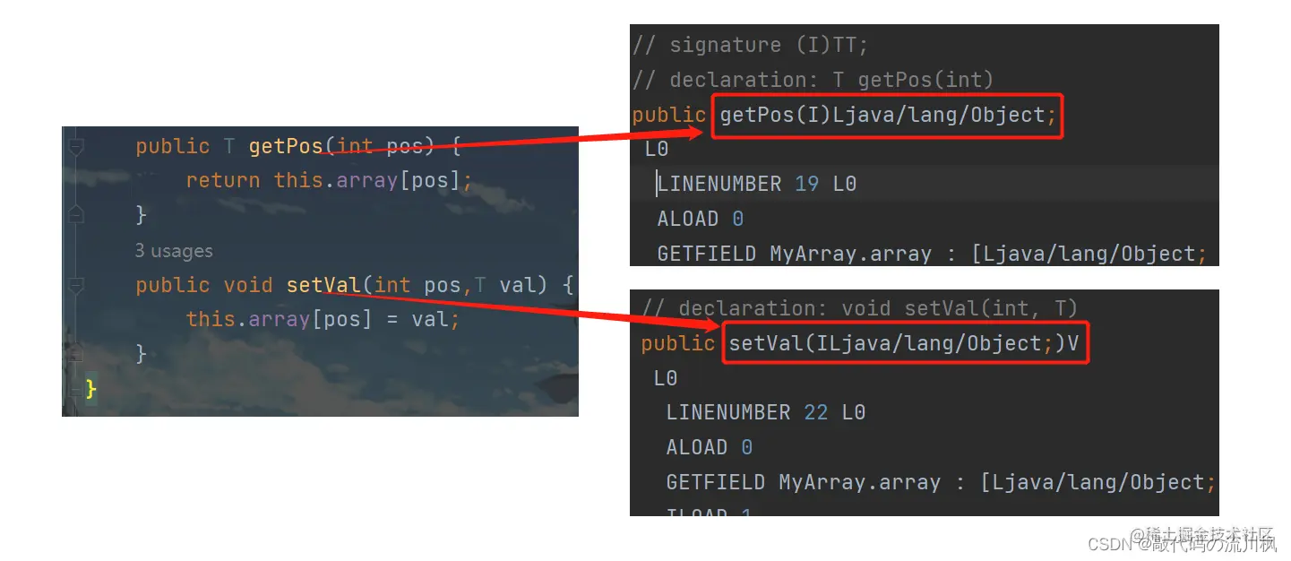 getPos中返回值为T,被替换为Object,setVal中返回值为空,即V,val参数类型被替换为Object