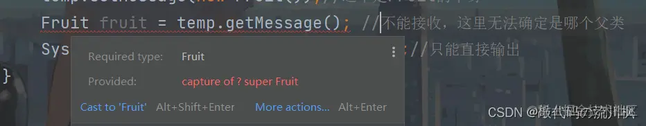 //Fruit fruit = temp.getMessage(); 不能接收,这里无法确定是哪个父类