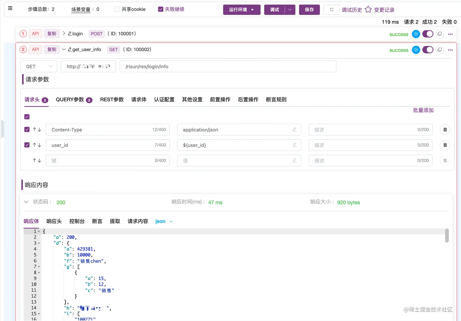 随后点击右侧调试按钮即可运行测试。通过下图可以看出,这个场景中包含的两个接口均执行通过。通过A接口传递过来的user_id,B接口成功获取到了用户信息: