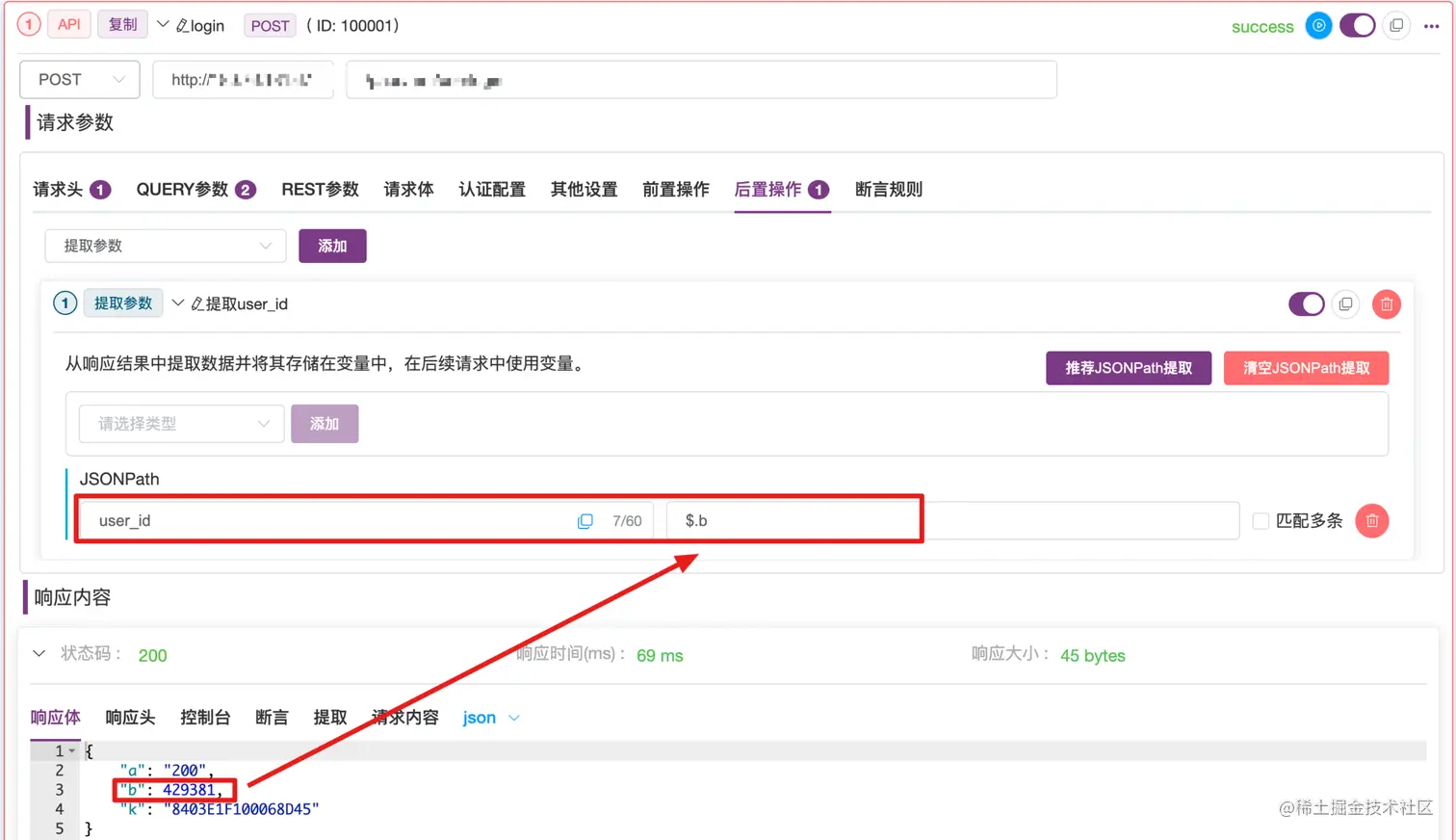 例如:我当前B获取用户信息接口需要用到A登录接口返回体中的b字段(user_id),那么则可以在A登录接口的后置操作中添加其他参数的操作:取名为提取user_id,变量名为user_id,jsonpath表达式为$.b