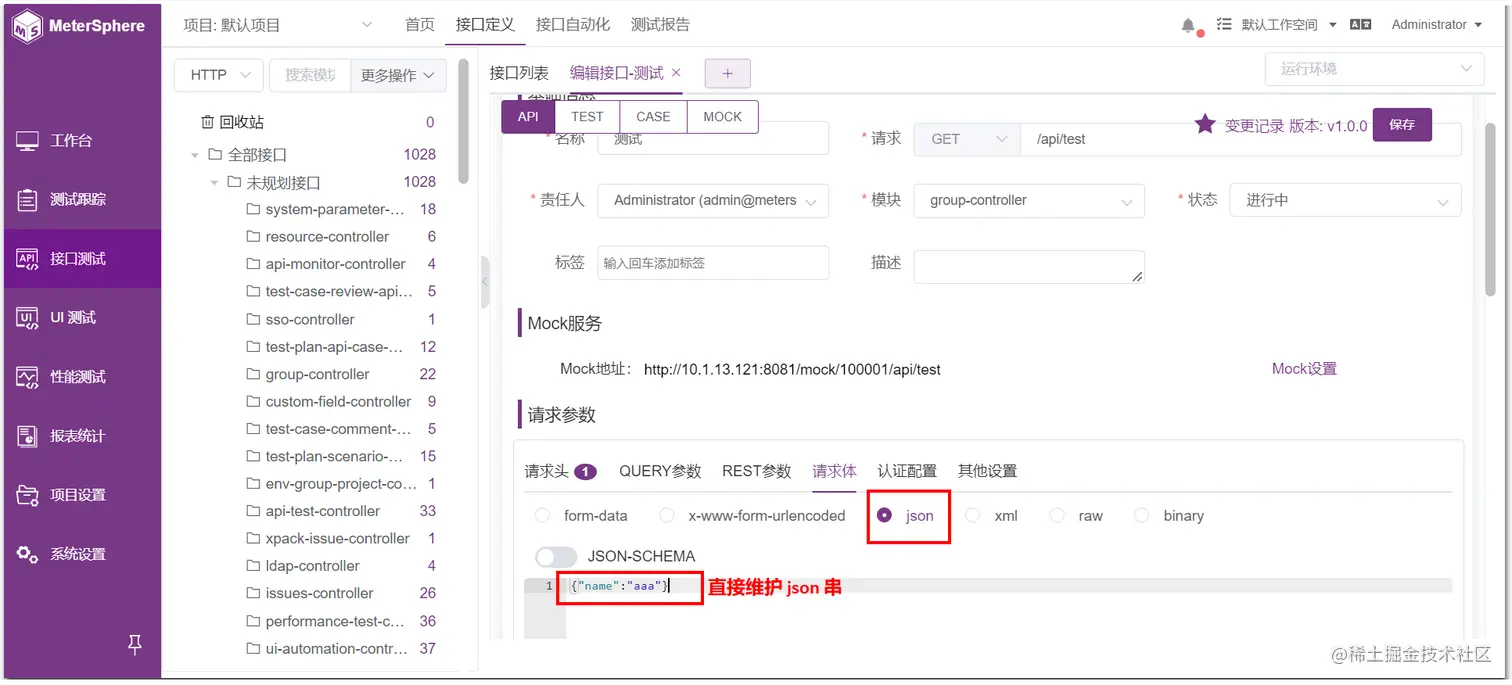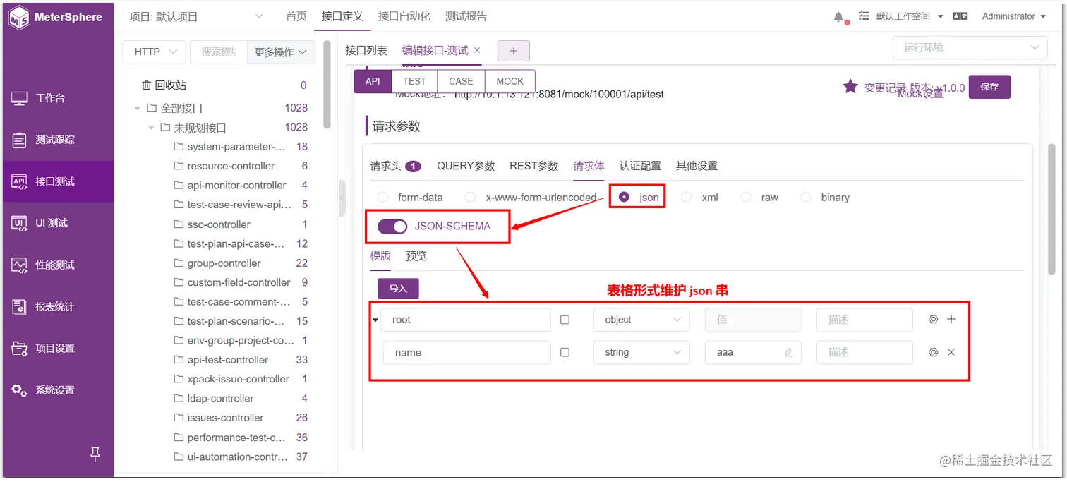 - 请求体是 json 格式时,系统默认提供两种形式维护 json 格式。