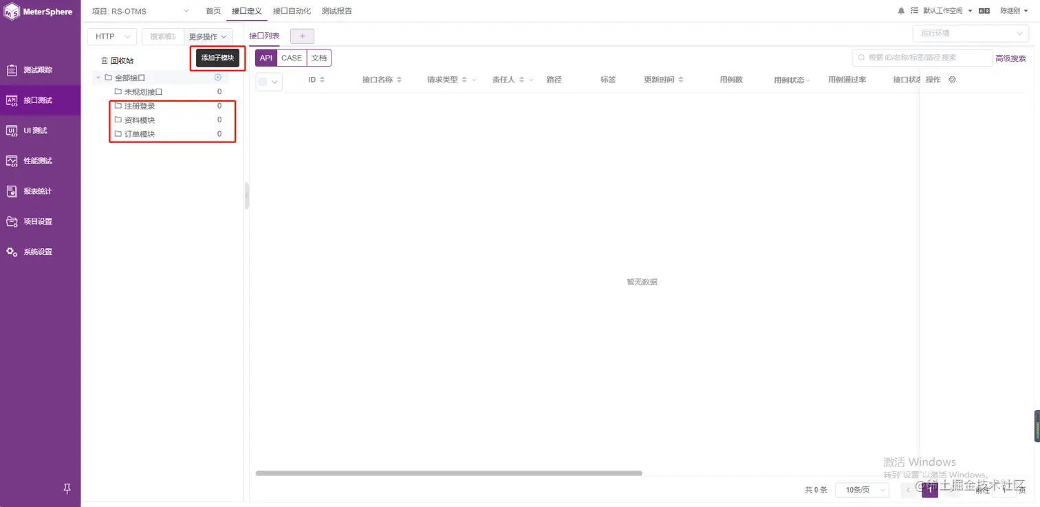 接口定义可以分模块管理,按照测试项目实际功能划分为多级模块进行管理,最多可分八级。鼠标悬浮在模块顶部,点击【+】创建一级模块。