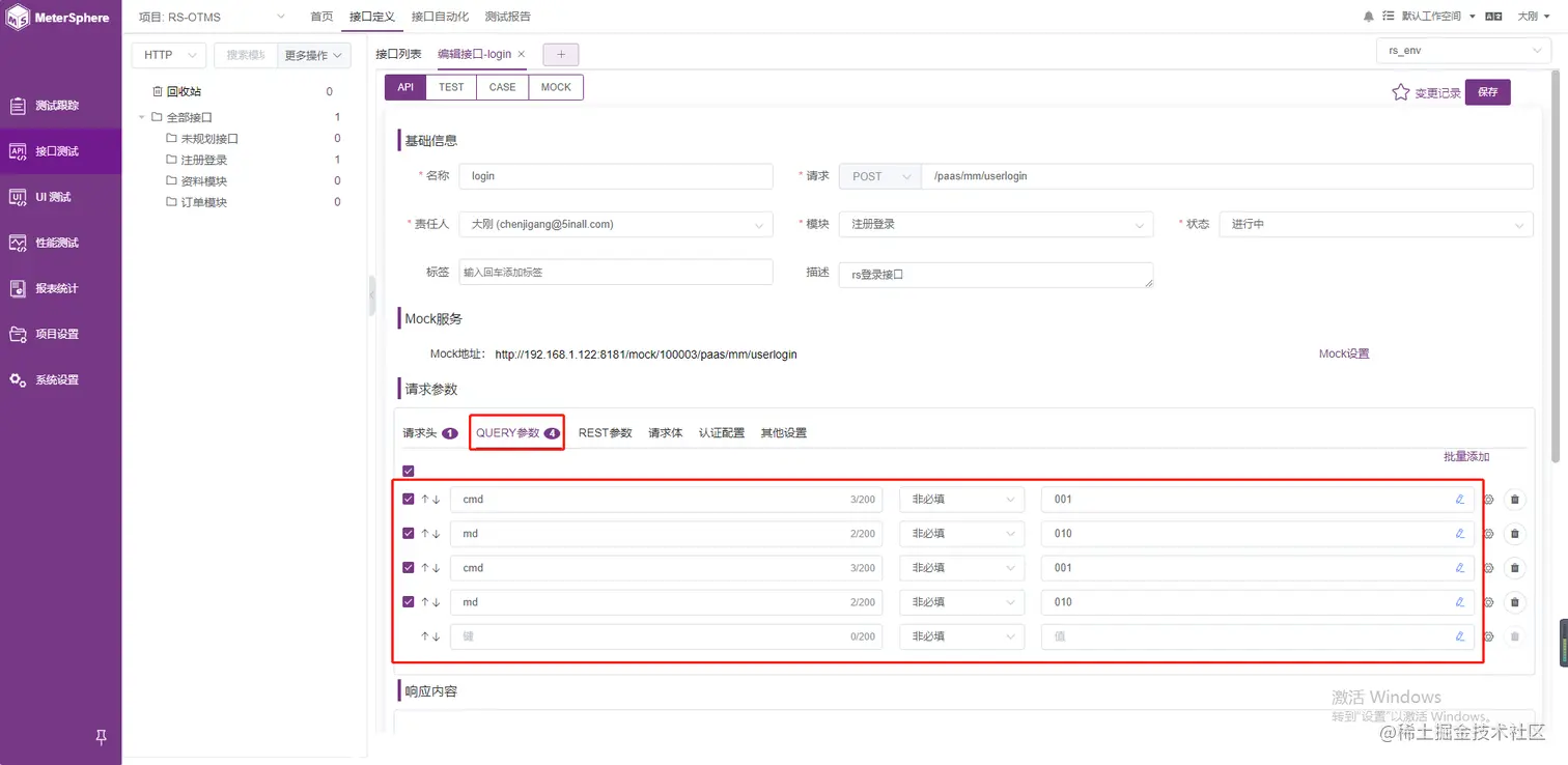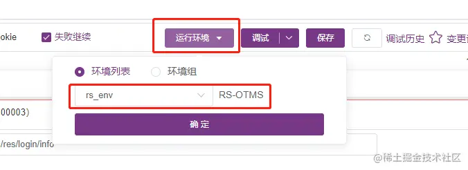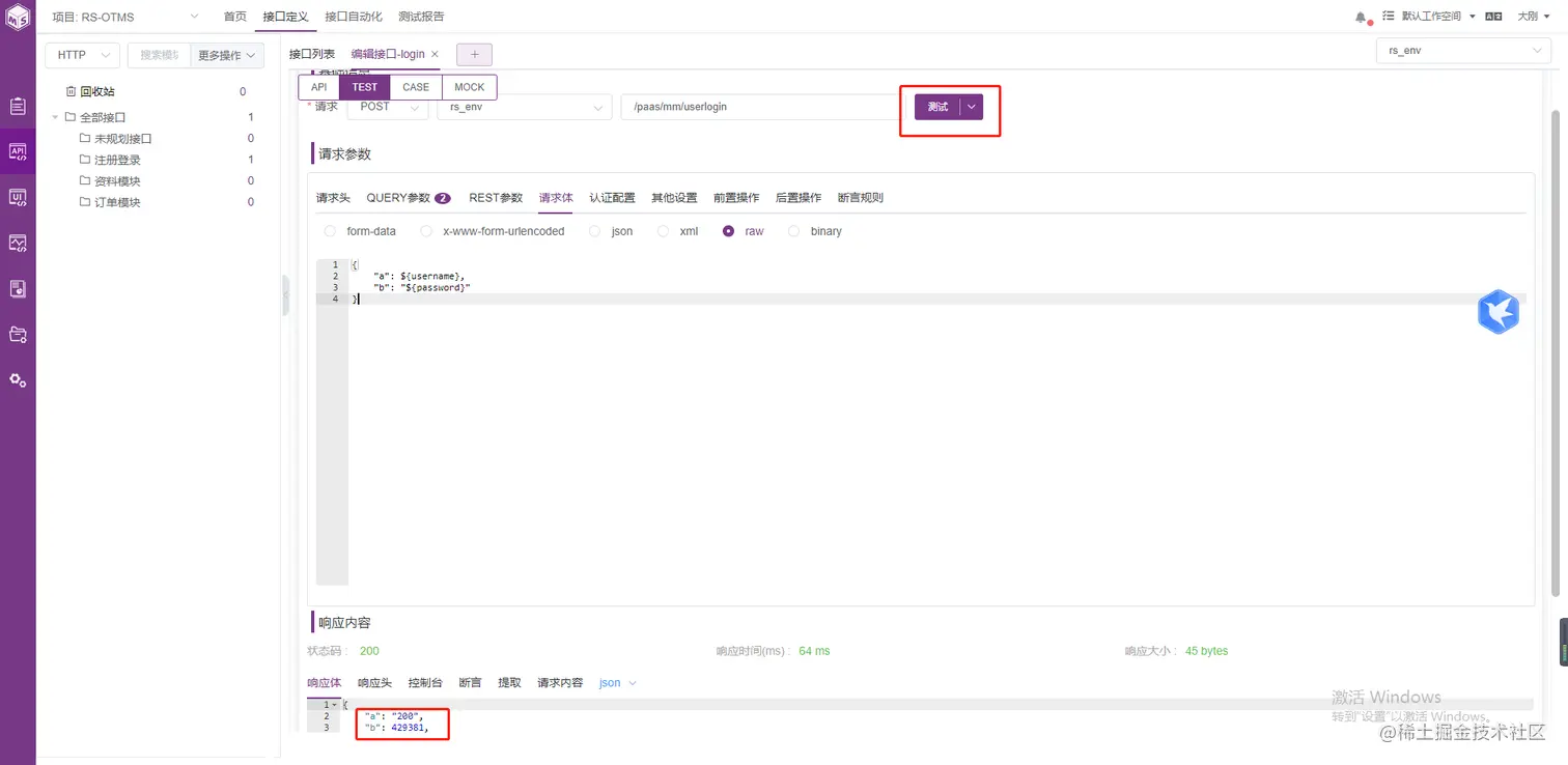 tab切换到TEST,注意:如果配置了全局环境,则需要在测试页面中选择配置的环境,我配置的环境名为rs_env,点击“测试”,如下:登录成功,返回response
