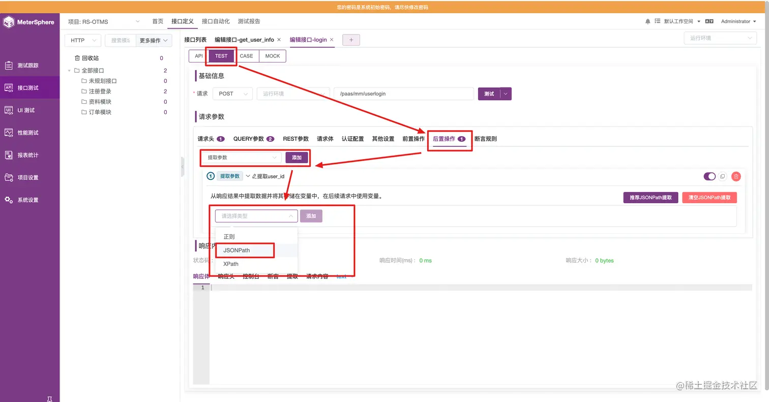在测试过程中,我们通常不止测试单一接口,还会测试接口的业务流程,这个时候就会用到“提取上一个接口的返回值、传递给后面的接口使用”。MS的参数提取与传递与Jmeter一致,可以使用Jsonpath方式提取: