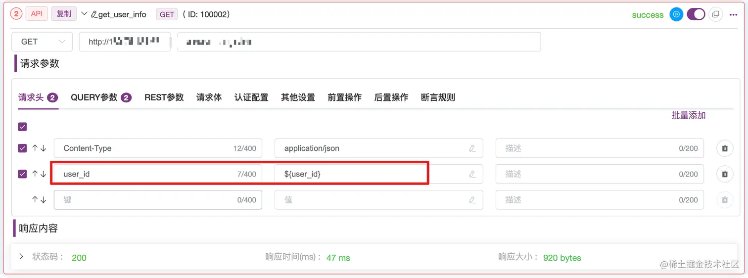 在B获取用户信息接口中,需要在接口请求头传入user_id,直接通过${user_id}引用: