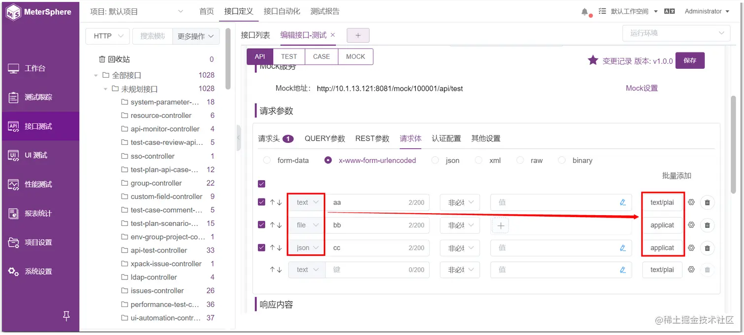 - 请求体是 form-data 和 x-www-form-urlencoded 格式时,可以选择参数类型。不同的参数类型,系统会提供默认属性。