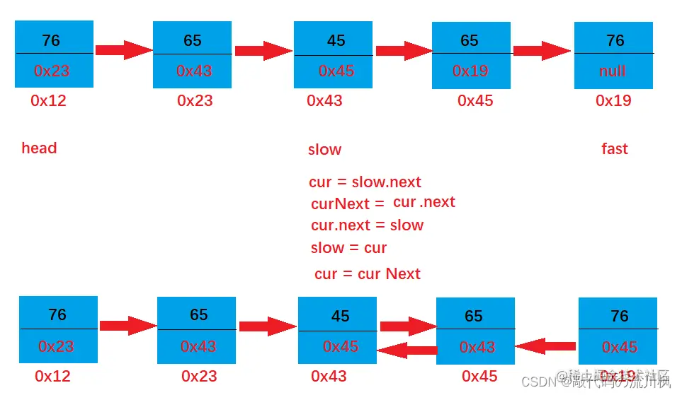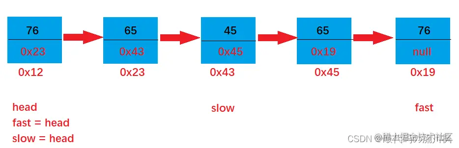 对上面这个链表,我们先定义一个快慢指针,fast和slow,让fast走两步,slow走一步,当fast=null或者fast.next=null时,说明slow为中间节点,如下图;