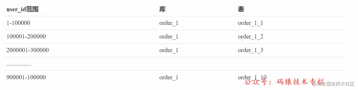 假如user_id是自增的数字,则可以根据user_id范围进行分片,每100万份分为一个库,每10万份分为一个表,此时单个库中将分为10张表,如下表: