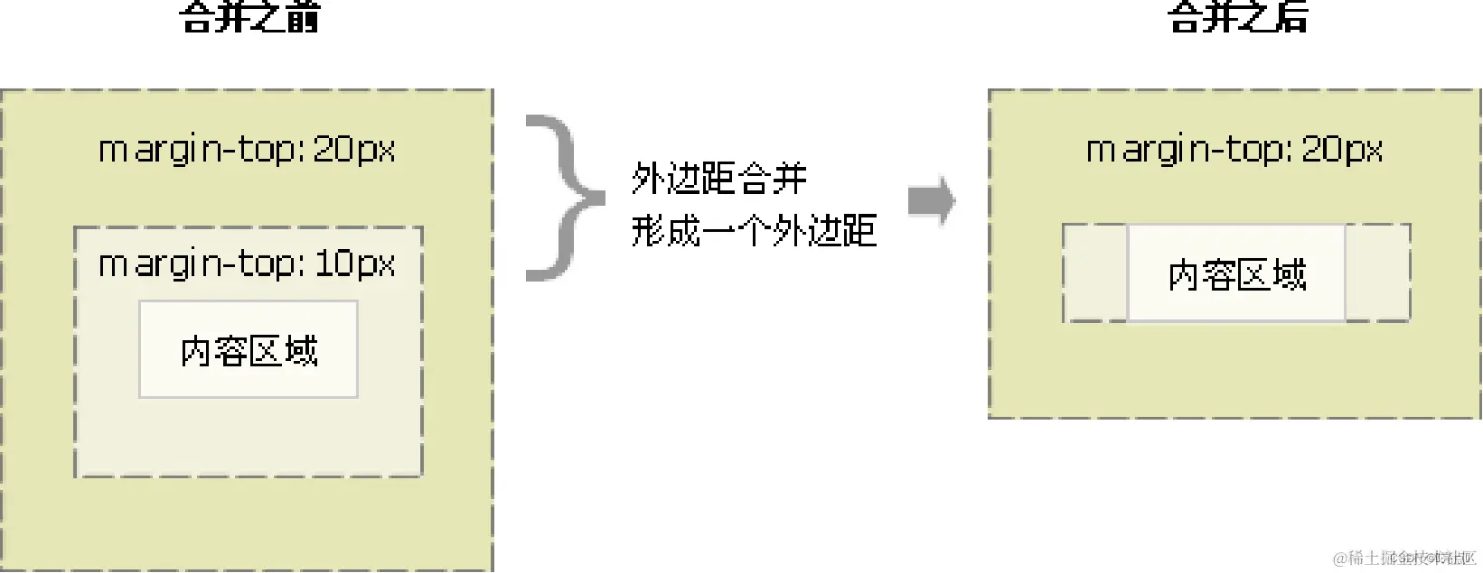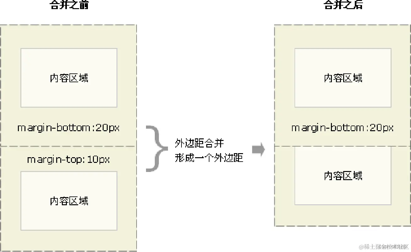当上下相邻的两个块元素(兄弟关系)相遇时,如果上面的元素有下外边距 margin-bottom,下面的元素有上外边距 margin-top ,则他们之间的垂直间距不是 margin-bottom 与 margin-top 之和。取两个值中的较大者这种现象被称为相邻块元素垂直外边距的合并。