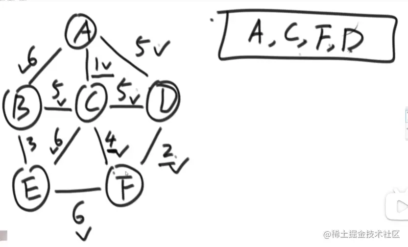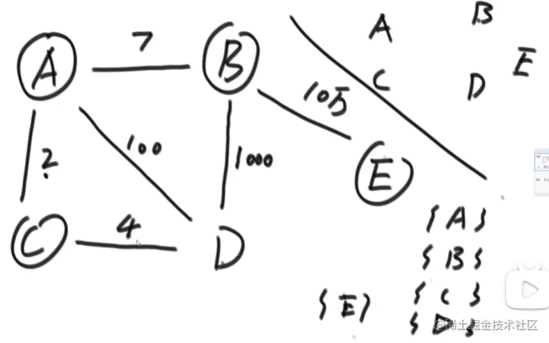 当边被解锁时,划勾 ,如在A时,AB,AC,AD都被解锁,每次添加新的点都会将该点的边加进priorityQueue中,在下一次在被解锁的边中且没有划下滑线的边中寻找权最小的边,若左右两个点都在set中,则需要选择其他点,假如到D时,此时AD都已在set集合中,需要选择BC,再从B到E