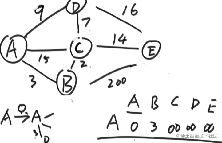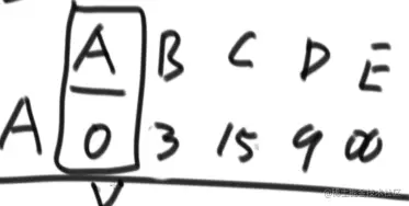 A到各点的距离初始化时除了本身为0之外其他都为正无穷,当发现从A出发到各点距离有比之前距离更小时,替换,遍历完一遍后,A到A本身的距离确定,锁死