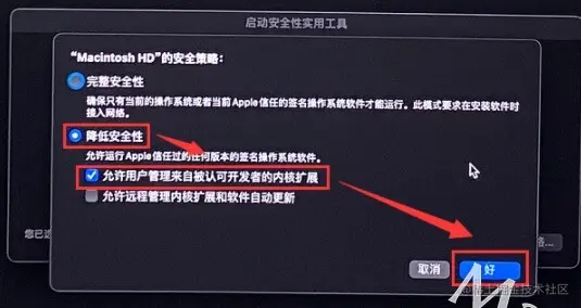 选择[降低安全性],勾选“允许用户管理来自被认可开发者的内核扩展”,点击[好]。