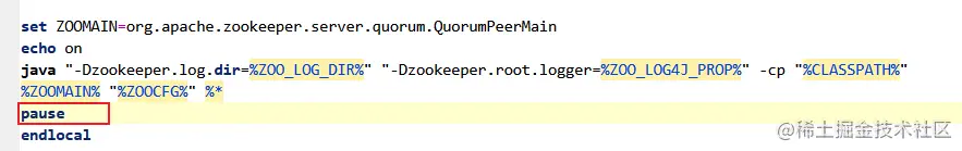 注:zookeeper启动控制台会闪退,可以在 zkServer.cmd 里面加一个 pause ,控制台就不会闪退了。zkCli.cmd 启动闪退一样的解决办法