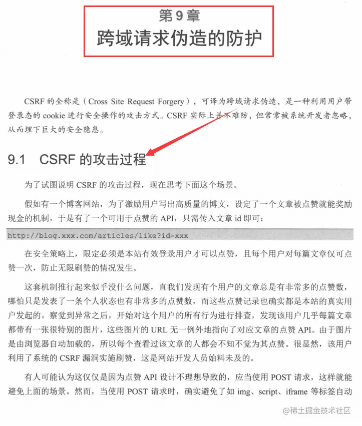 第9章对跨域请求伪造的防护进行了讲解,CSRF的全称是( Cross Site Request Forgery) ,可译为跨域请求伪造,是一种利用用户带登录态的cookie进行安全操作的攻击方式。CSRF实际上并不难防,但常常被系统开发者忽略,从而埋下巨大的安全隐患。