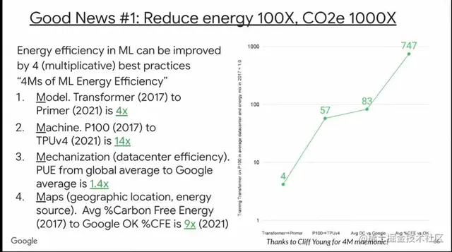 第二个因素是硬件。2017年所使用的P100 GPU和当前最新TPU的性能相差了14倍。所以,前两个因素结合,可以将能耗和碳排放量降低60倍。