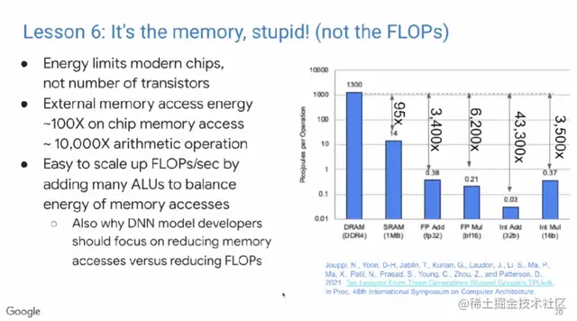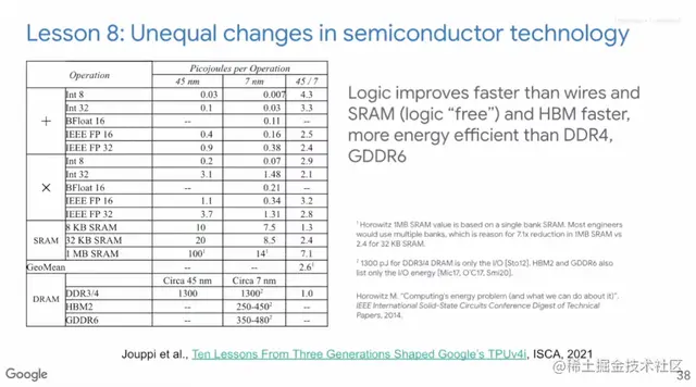 现代微处理器最大的瓶颈是能耗,而不是芯片集成度。Yahoo!创始人Mark Horowitz在十多年前就发现,访问片外DRAM的能耗是访问片上DRAM的100倍,是算术运算的5000~10,000倍。因此,我们希望可以通过增加浮点运算单元(FPU)来分摊内存访问开销。基于Mark Horowitz的数据,芯片上的FPU数量被设置为10,000个左右。ML模型开发人员常常试图通过减少浮点运算数来优化模型,但其实减少内存访问数才是更有效的办法。
