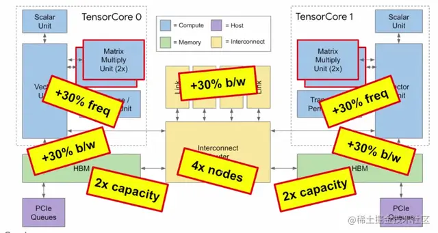 - 矩阵乘法单元(MXU)的数量翻倍,因此峰值性能也翻倍;
