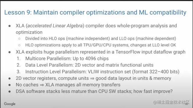 为什么保持后向ML兼容性如此困难?因为浮点加法不符合结合律,所以运算顺序可能会影响运算结果。而TPU的任务就是让所有机器对编译器而言都没有区别,以便可以在重组代码的同时获得相同的高质量结果,以实现后向ML兼容性。