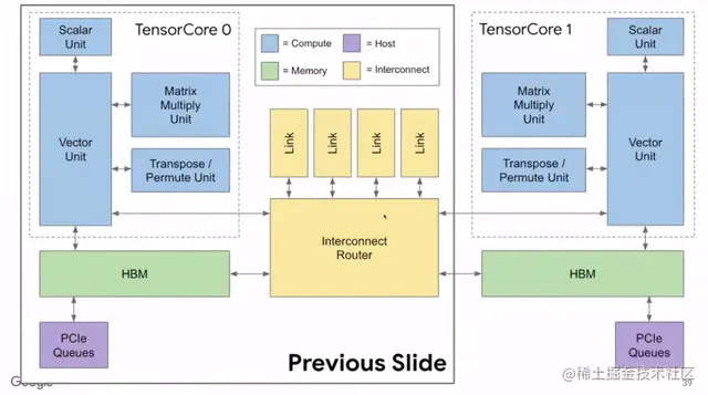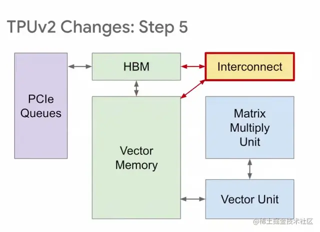 第五步,我们在HBM和向量存储区之间增加互连(Interconnect),用于TPU之间的连接,组成我们之前提到的Pod超级计算机。以上就是从TPU v1到TPU v2的改进。