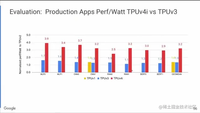 上图是TPU v4i和TPU v3的每瓦性能对比,红色是TPU v4i,蓝色是TPU v3,前者的每瓦性能是后者的两倍以上。
