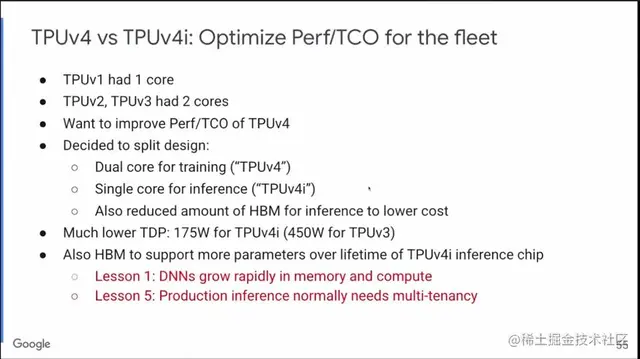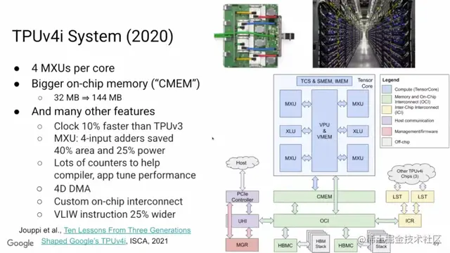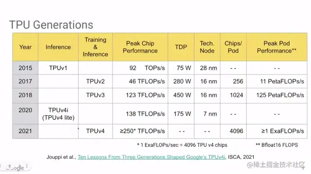 上图展示了TPU的发展历史。其中,Google尚未公布TPU v4i(TPU v4 lite)的相关细节。去年Google宣布TPU v4i已在云服务上可用,也发表了一篇关于TPU v4i的论文(www.gwern.net/docs/ai/sca… )。