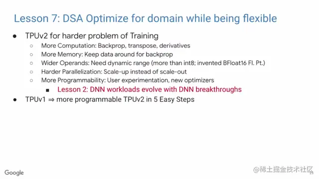作为一种针对特定领域的架构(DSA),TPU的难点在于既要进行针对性的优化,同时还须保持一定的灵活性。Google在推出用于推理的TPU v1之后,决定攻克更难的问题——训练。