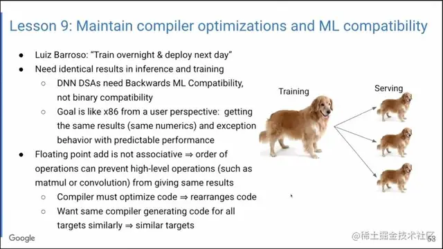 此外,编译器的后向ML兼容性非常重要。我的同事Luiz Barroso主管Google的一个与计算机架构无关的部门,他表示不希望在训练中花太多时间,希望一晚上就可以训练好模型,第二天可以直接部署。我们希望训练和推理时结果一致,这就是我们说的后向ML兼容性,我们还希望它能在所有TPU上运行,而不是每次更改TPU时都要重新训练。