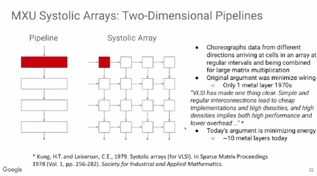 TPU v1使用了脉动阵列(systolic array),这一概念早在40年前就被提出,做法是以固定的时间间隔使数据从不同方向流入阵列中的处理单元(cell),最后将数据累积,以完成大型矩阵乘法运算。由于70年代的芯片只有一个金属层,不能很好地实现互连,所以Kung和Leiserson提出“脉动阵列“以减少布线,简化连接。
