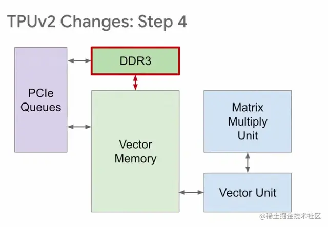第四步,TPU v1使用DDR3内存,因为它针对的是推理,只需使用已有的权重,不需要生成权重。针对训练的TPU v2则不一样,训练时既要读取权重,也要写入权重,所以在v2中,我们将原本的DDR3改为与向量存储区相连,这样就既能向其读取数据,又能向其写入数据。