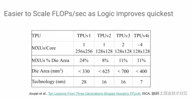 从TPU v3到TPU v4i,矩阵乘法单元的数量再次翻倍,但芯片面积却没有扩大。如前所述,计算逻辑的发展速度是最快的。