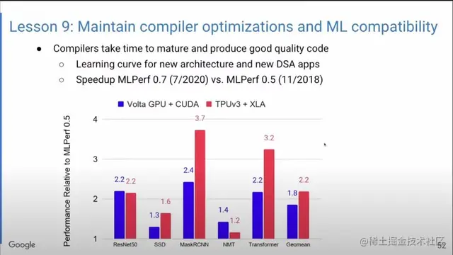 上图显示了编译器优化的提速效果。蓝色表示使用GPU,红色表示使用TPU,经过短短十几个月的优化后,不少模型的性能都提升到了两倍。要知道,对C++编译器而言,如果能在一年内把性能提升5%-10%就已经非常了不起了。