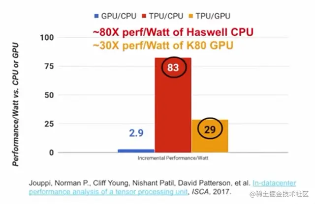 于是,Google在2014年开始研发TPU,项目进展神速,仅15个月后TPU就可在Google数据中心部署应用,而且TPU的性能远超预期,它的每瓦性能是是GPU的30倍、CPU的80倍(数据源自论文:arxiv.org/ftp/arxiv/p… )。